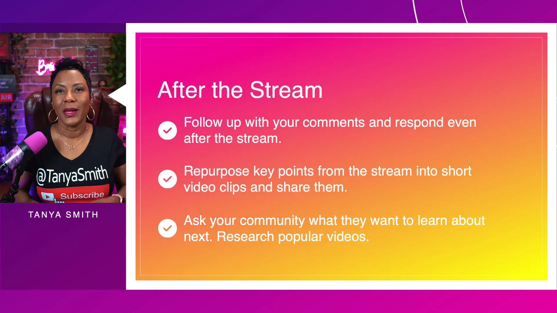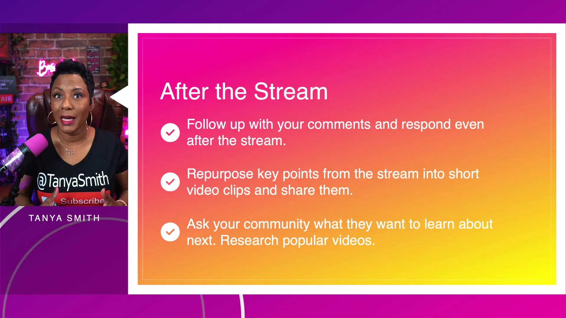 Post-Stream: Follow up on comments, repurpose key content, and engage your community to find out what they want to learn next.