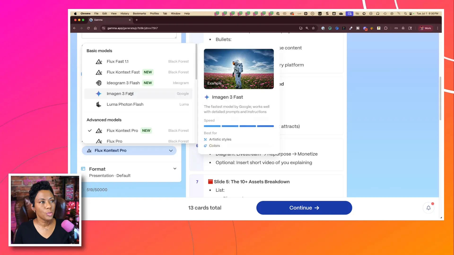 Here’s where the real magic happens. Gamma allows you to generate AI images directly within your slides. You can specify styles—like illustrated, 3D Pixar-style, or realistic—and even define the scene. For example, I asked for a “3D Pixar style black woman podcaster with mic and camera in the scene,” and Gamma whipped up some fun visuals for me.