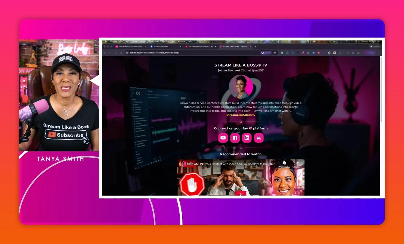 Tanya Smith is the CEO of Get Noticed with Video LLC and host of Stream Like a Boss® TV, where she helps podcasters and livestream creators turn crickets into clients—without chasing algorithms or losing their authentic voice. Through practical strategies and proven workflows, Tanya empowers creators to grow their audience, build authority, and monetize their message with confidence.